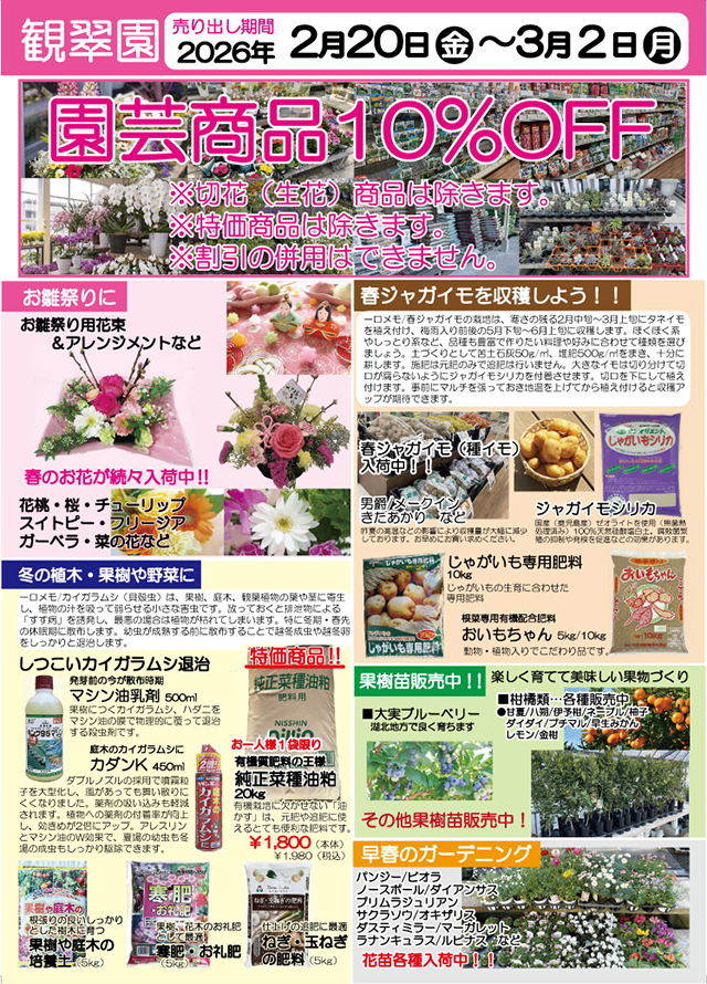 2026年、今年最初のセールは【園芸商品全て10%OFF】 鉢物・苗物・種・資材など(生花、特価商品は除きます) 欲しかった商品や春の園芸シーズンに向けて必要な資材など、この機会に是非お買い求めください。